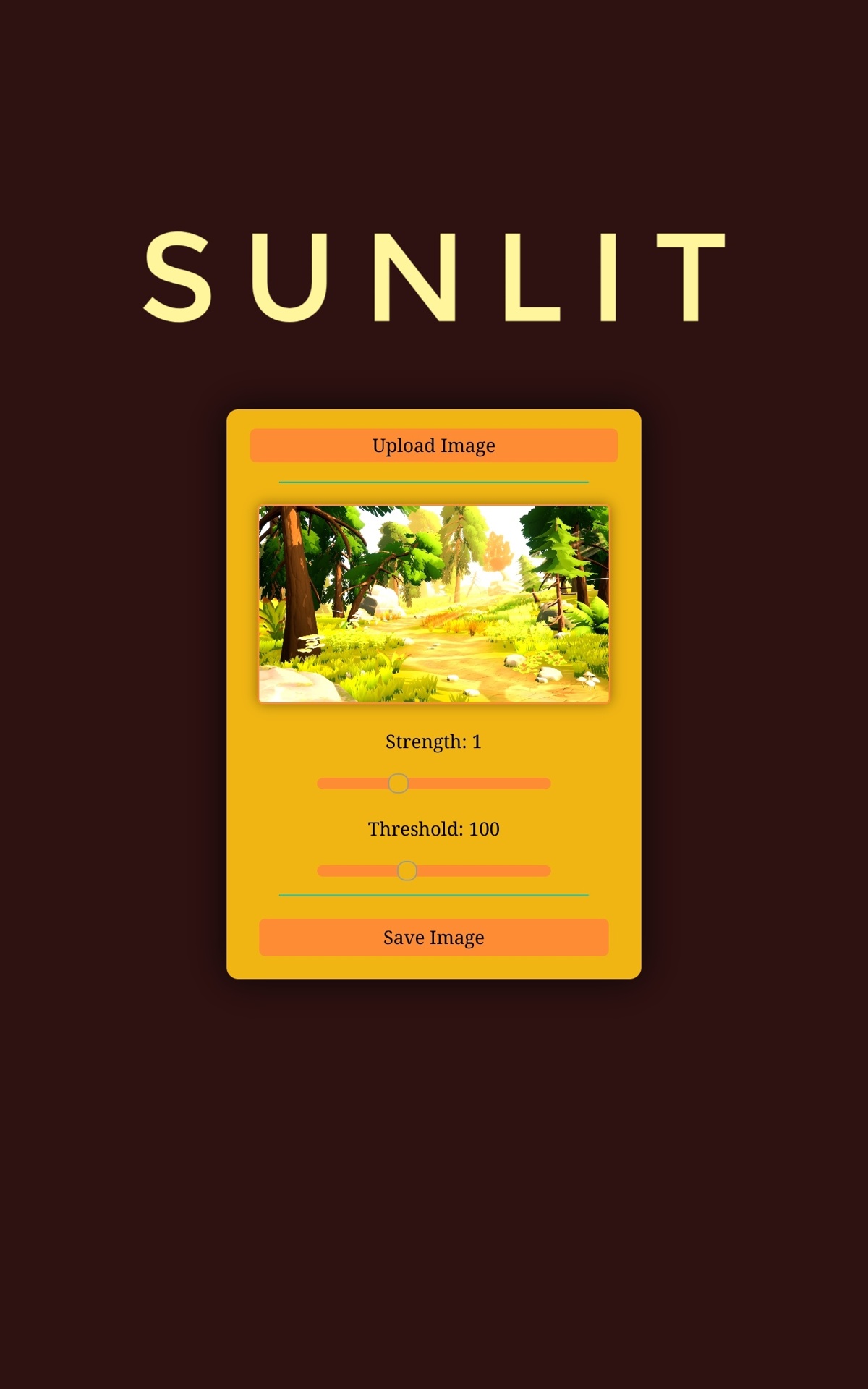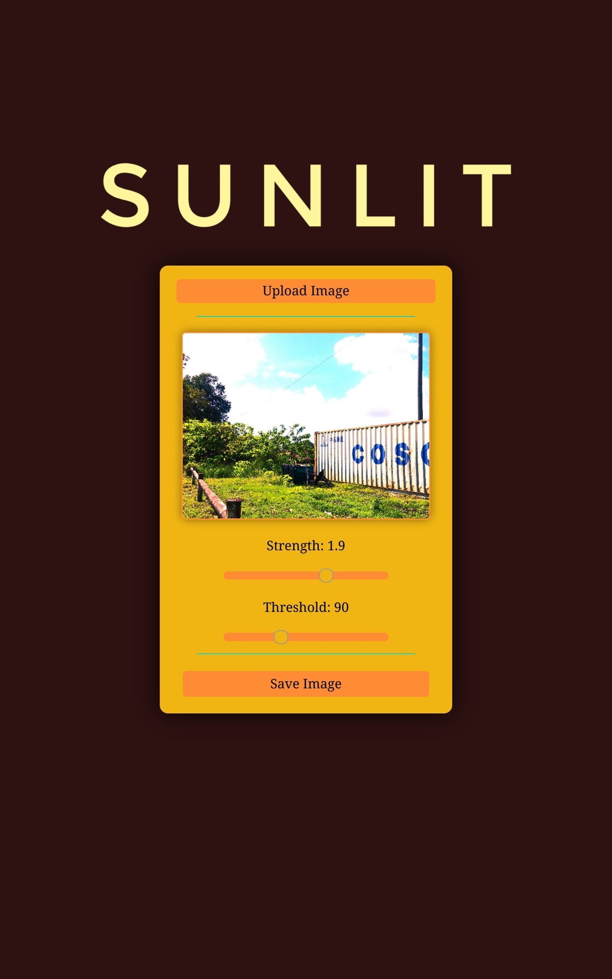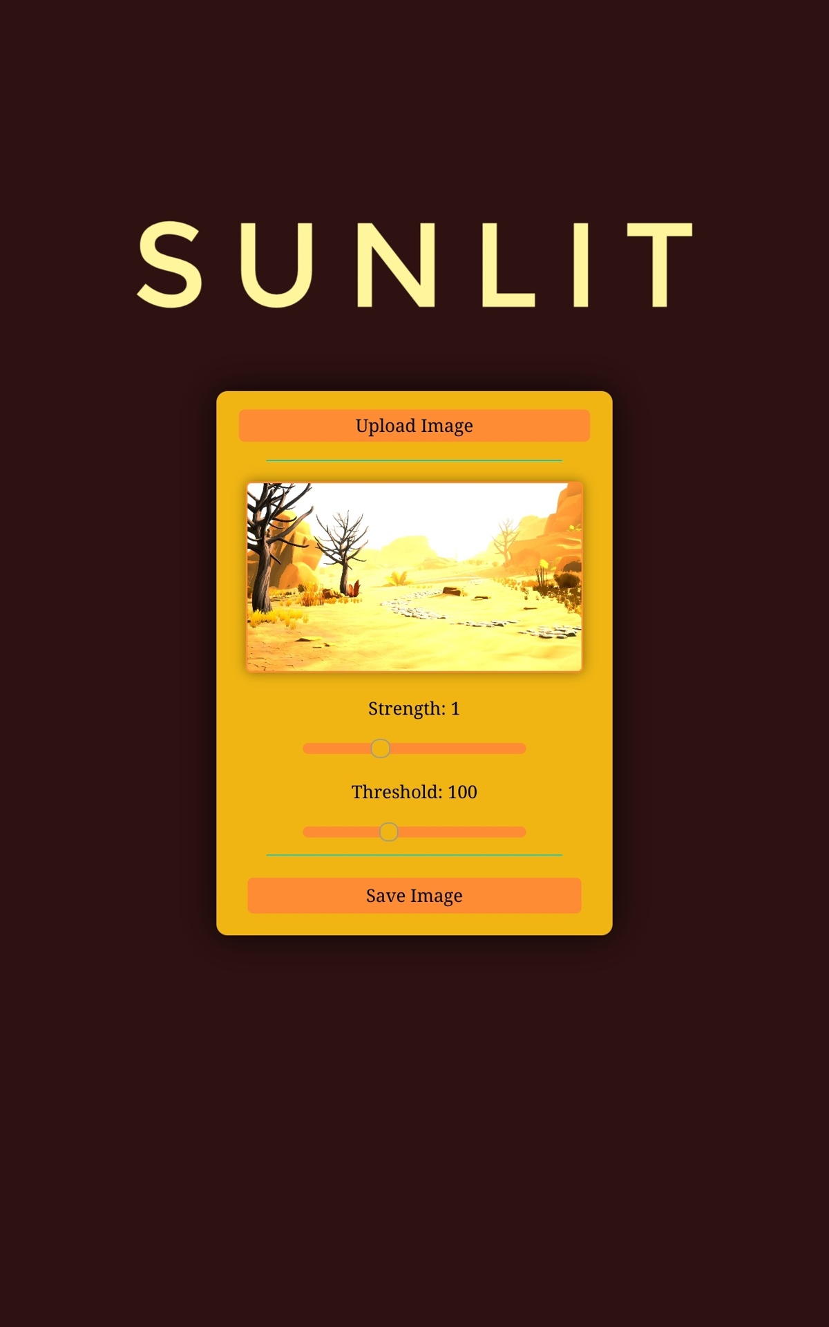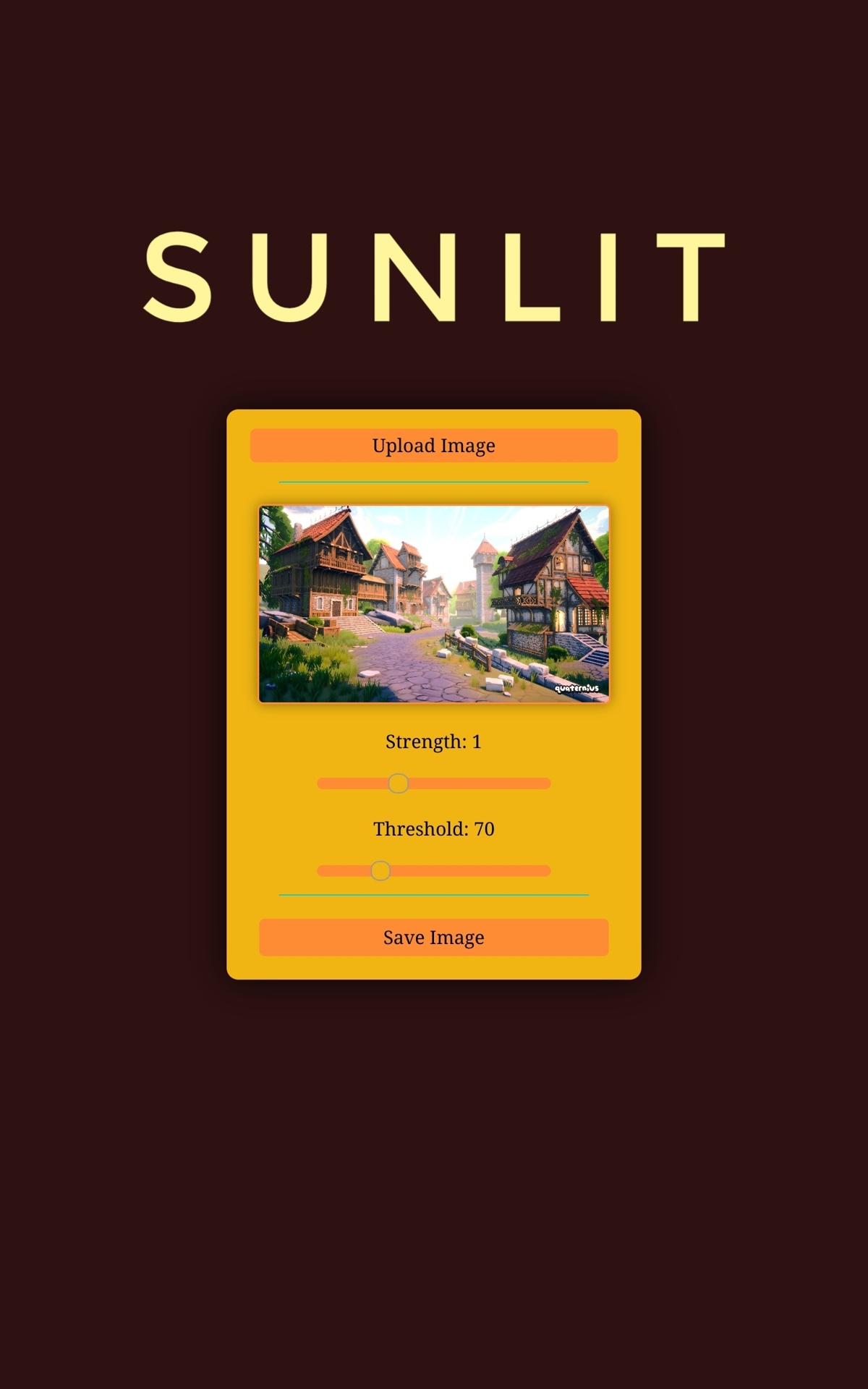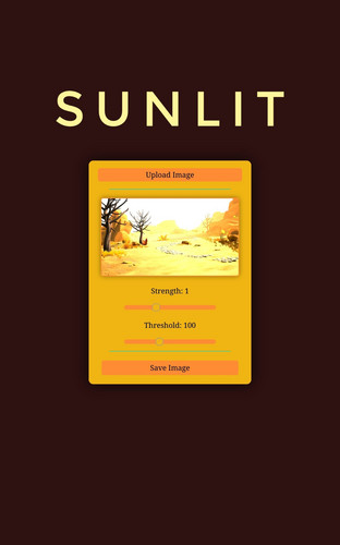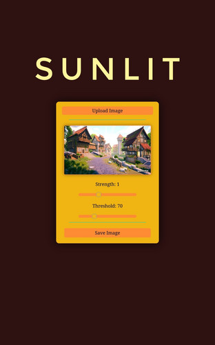 Click the "Upload Image" button, then adjust the "Strength" of the sunlight and the "Threshold" for surfaces to be considered "Where sunlight touches", click the image to toggle seeing the difference between the original image and the sunlit image, and then when you are pleased with the results, hit the "Save Image" button and use your image for any purpose!