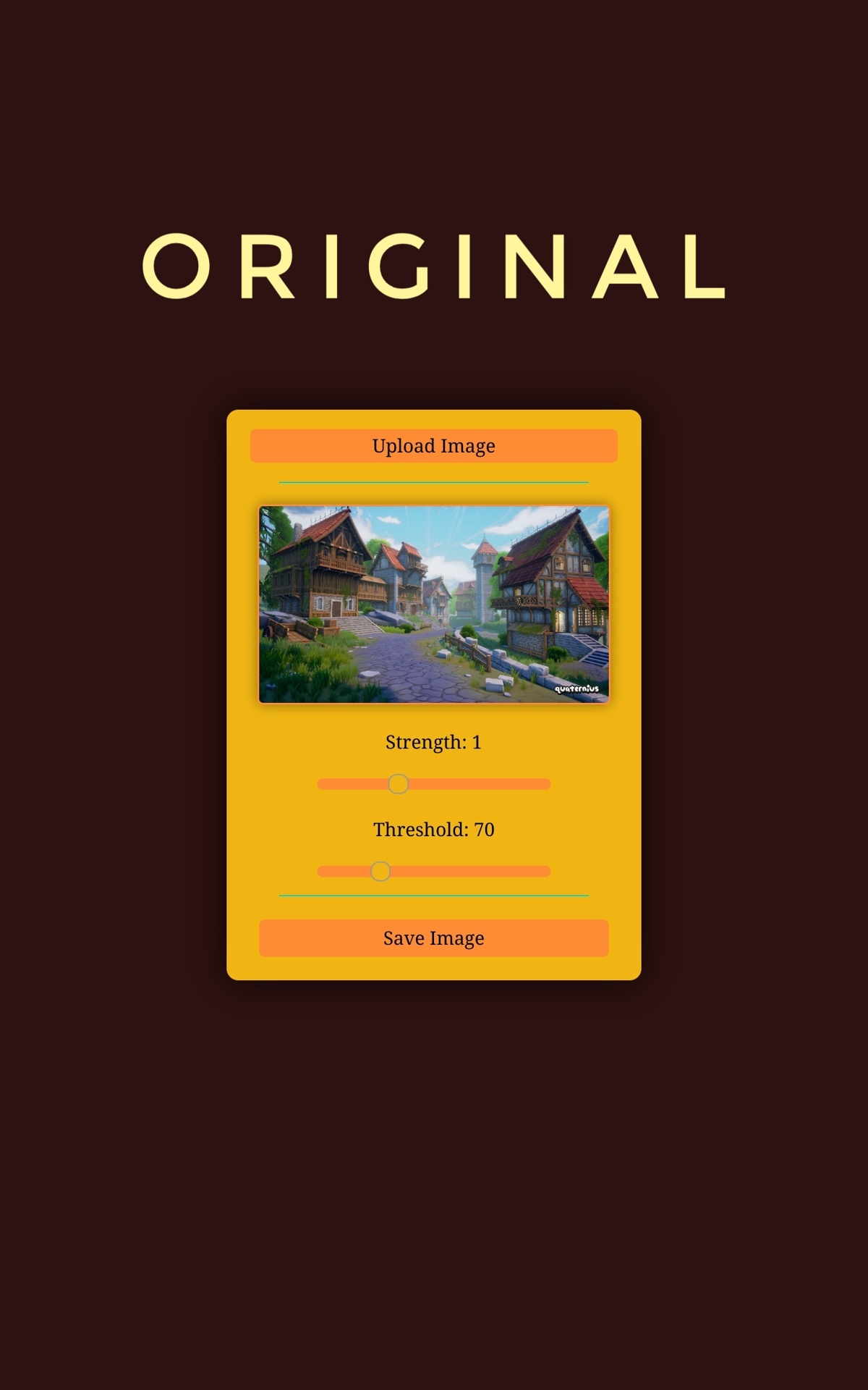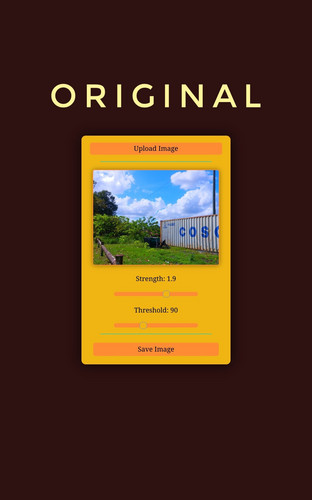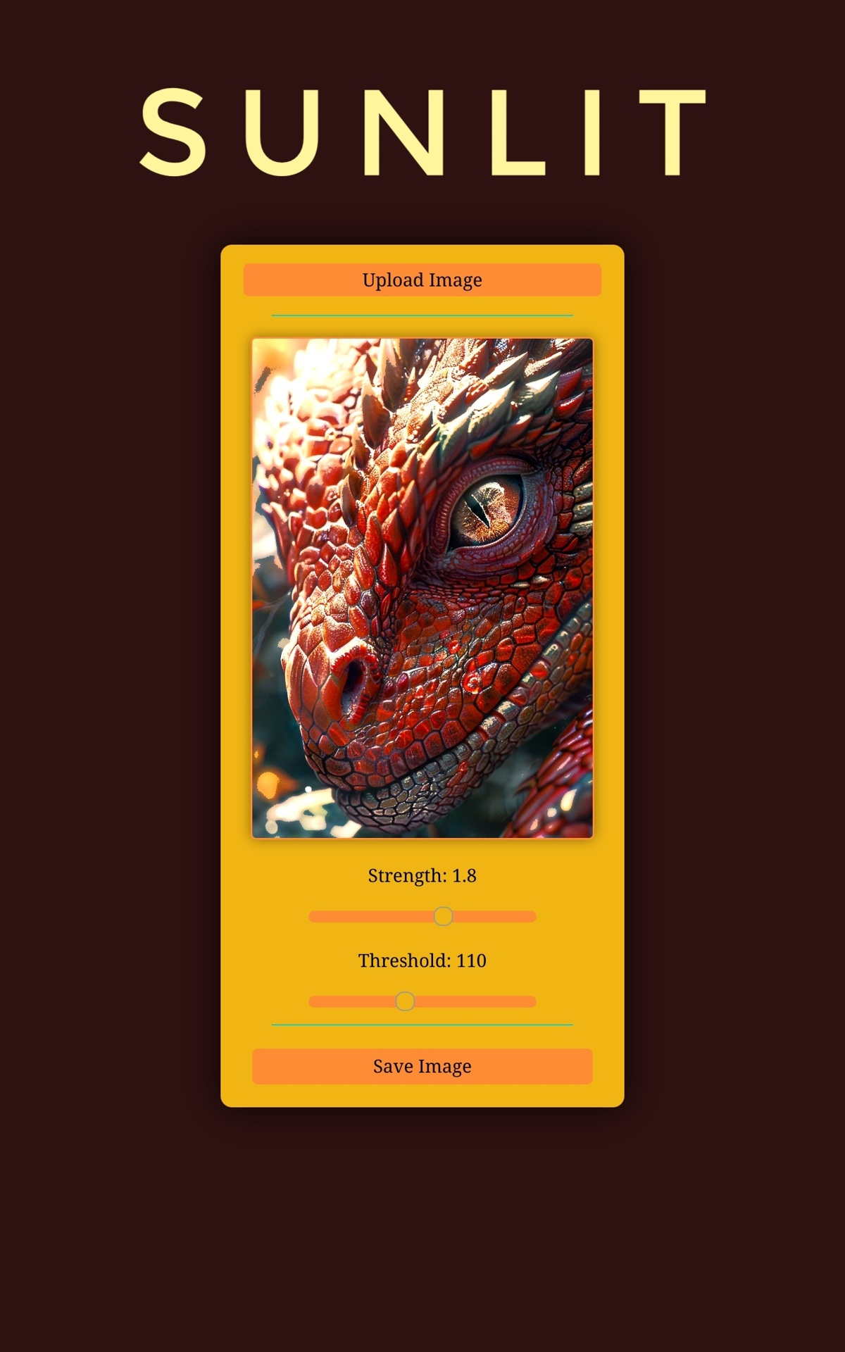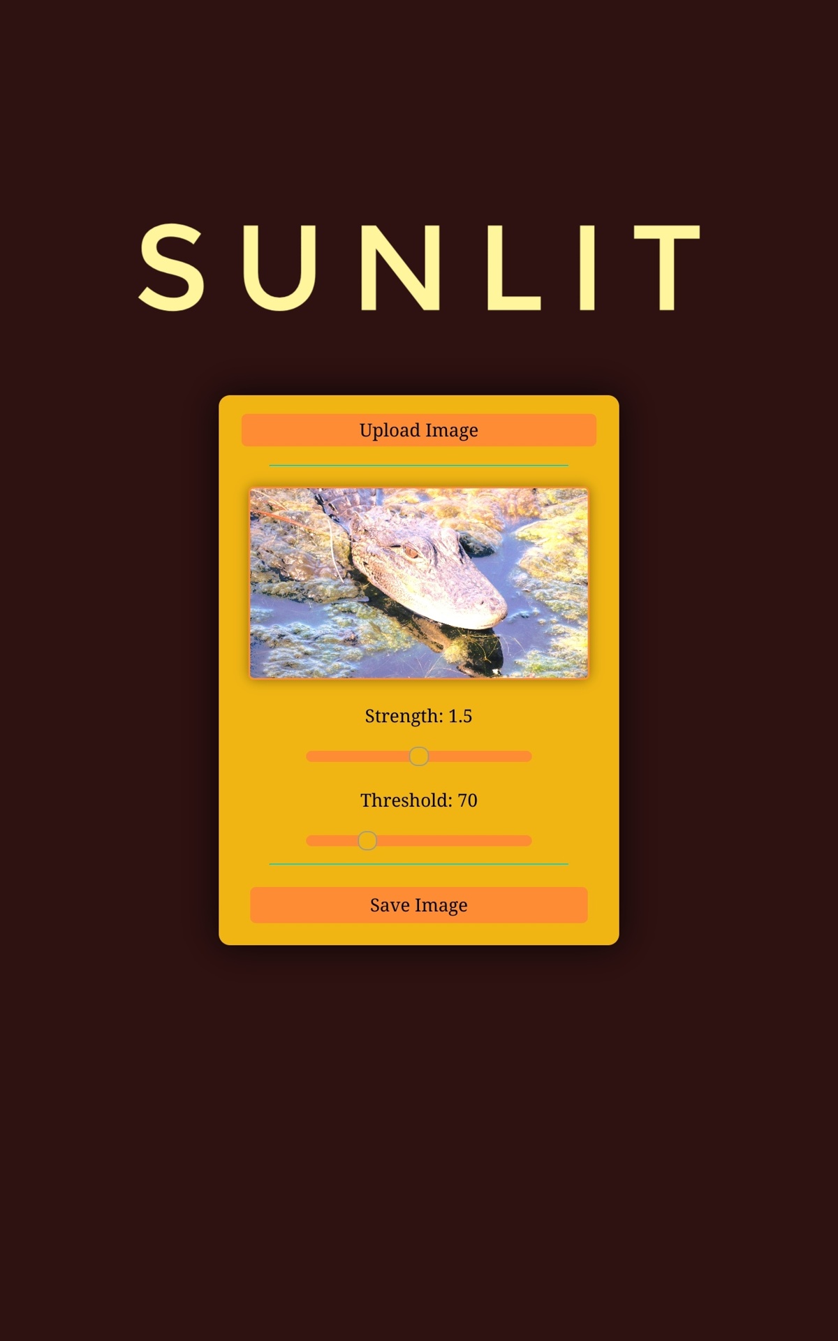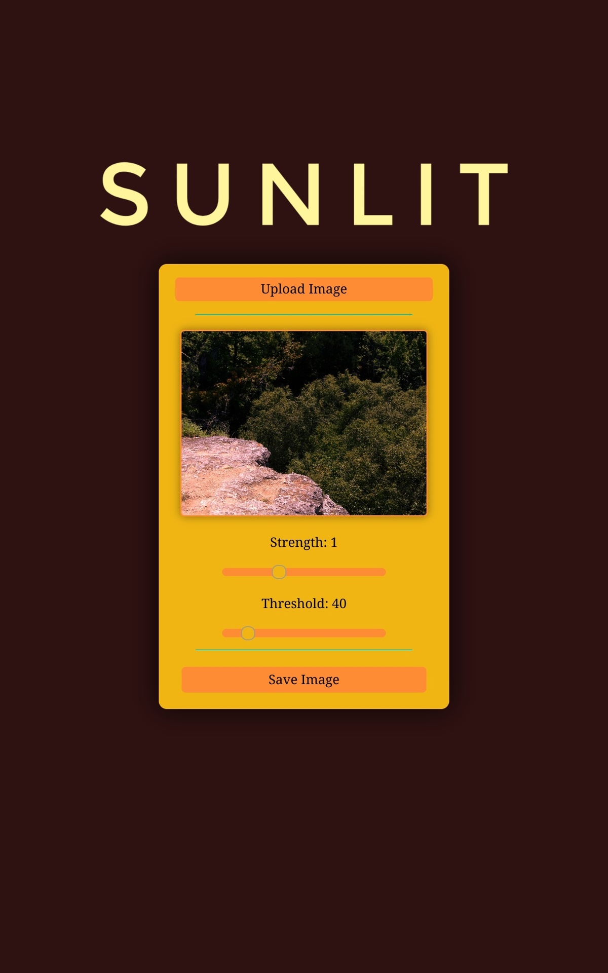 Click the "Upload Image" button, then adjust the "Strength" of the sunlight and the "Threshold" for surfaces to be considered "Where sunlight touches", click the image to toggle seeing the difference between the original image and the sunlit image, and then when you are pleased with the results, hit the "Save Image" button and use your image for any purpose!