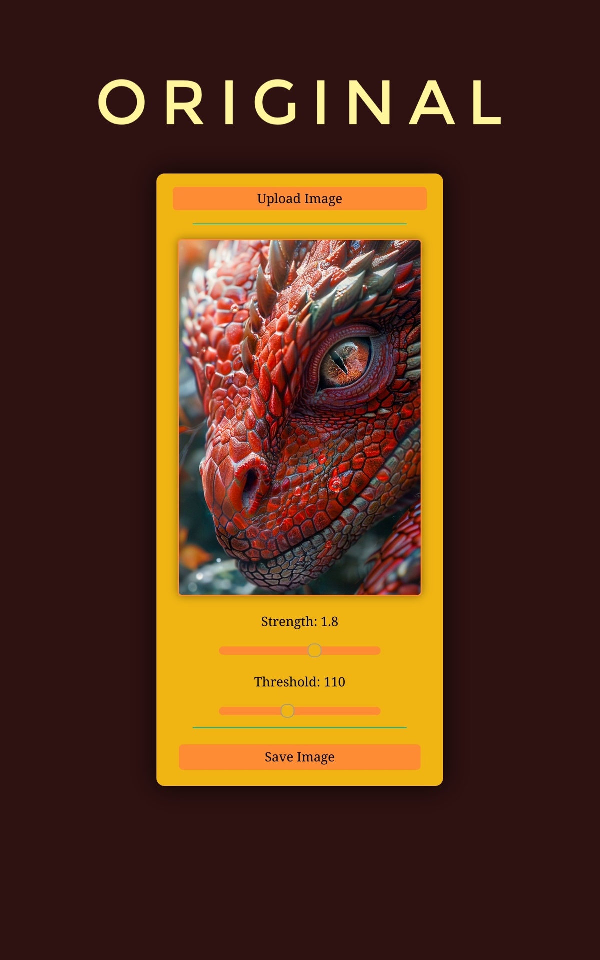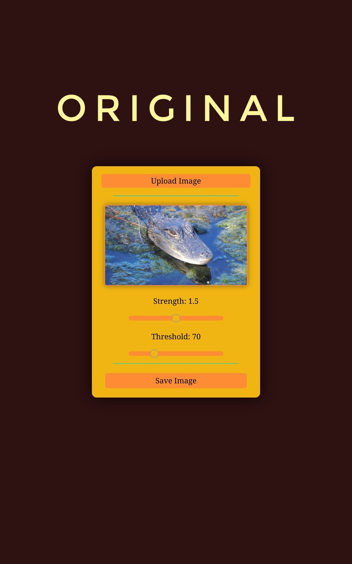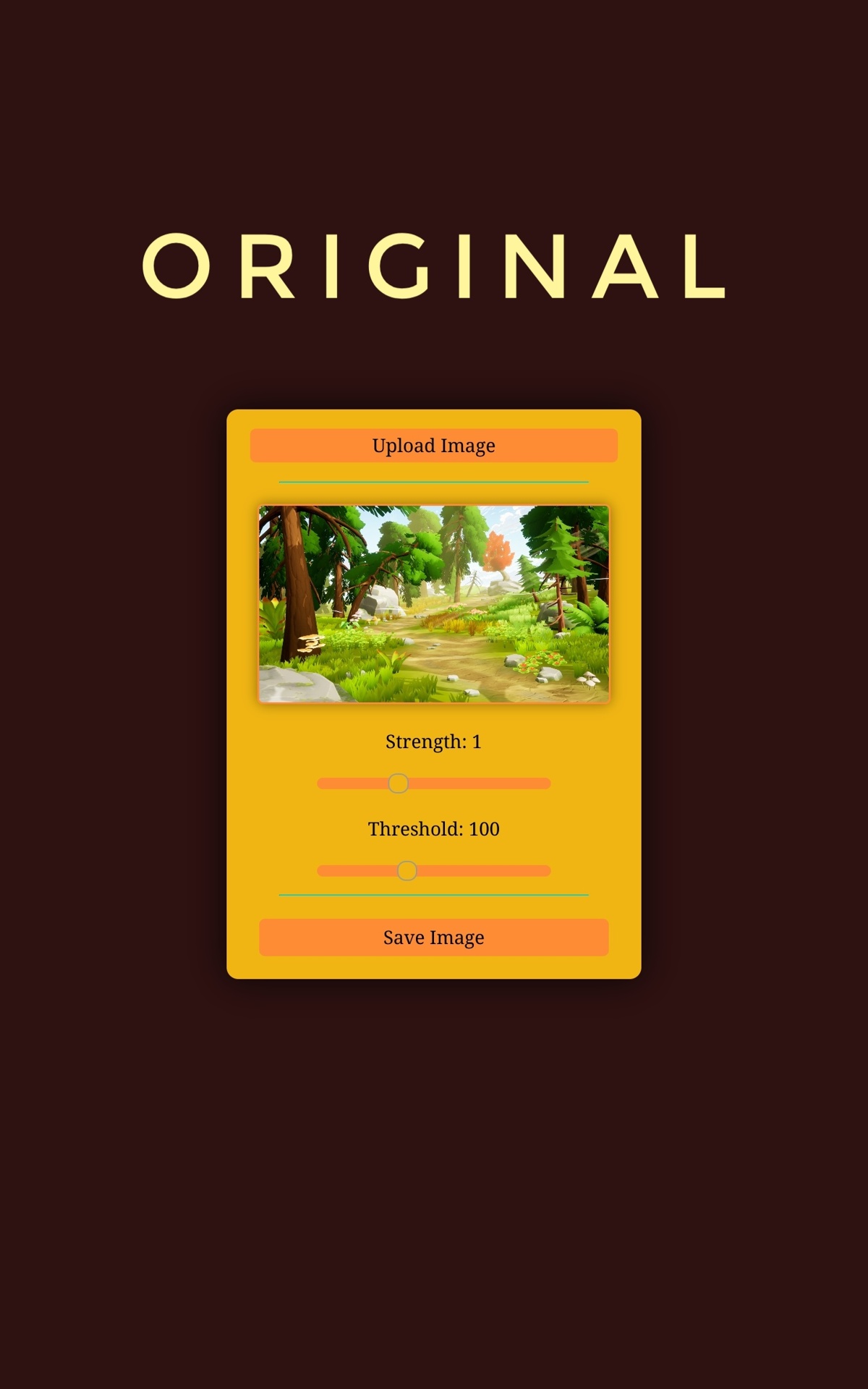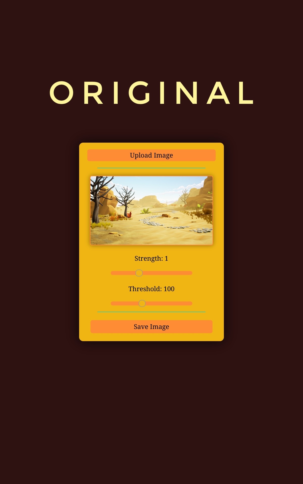 Click the "Upload Image" button, then adjust the "Strength" of the sunlight and the "Threshold" for surfaces to be considered "Where sunlight touches", click the image to toggle seeing the difference between the original image and the sunlit image, and then when you are pleased with the results, hit the "Save Image" button and use your image for any purpose!